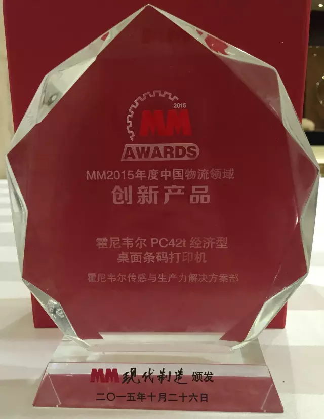 此次活动由MM《现代制造》杂志社举办,历时三个月,历经用户投票、专家评选和终审以及评审委员会综合评审环节,霍尼韦尔PC42t经济型桌面条码打印机,凭借安静可靠的操作性能、极佳的性价比及现代化的web用户界面等显著特点从众多优秀产品中脱颖而出,获得“MM 2015年度中国物流领域创新产品”大奖。